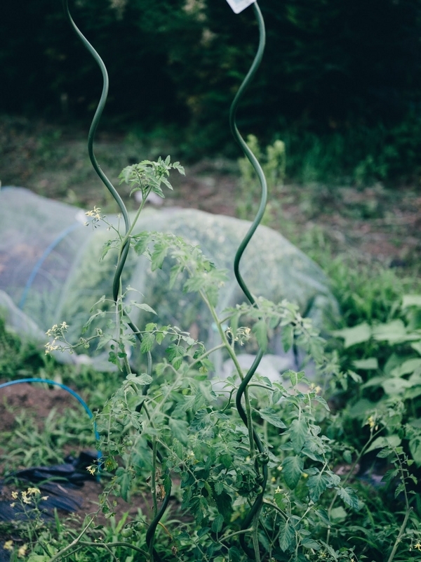ロンギヌスの槍(ヱヴァ版)みたいな支柱はトマト専用のもの。ホームセンターで見つけて、試しに買ってきた。この螺旋に、トマトが勝手に巻き付いてくれる。めっちゃくちゃいい。そして楽。開発した人にノーベル賞あげたい。
